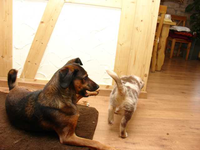 Als wir zu Hause ankamen, war da schon ein kleiner Dackel im Revier. Nun ich war erstmal froh überhaupt irgendwo zu sein, es war warm und gemütlich und ich total erschöpft von den Strapazen der letzten Wochen. Der Dackel ärgerte mich ständig. Ich konnte mich nicht wirklich wehren, hatte ja auch gar keine Kraft mehr. An meine neue Umgebung konnte ich mich nur schwer gewöhnen.