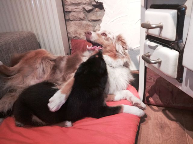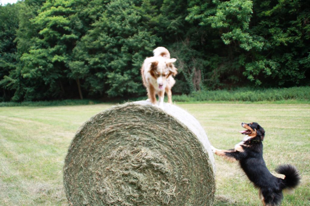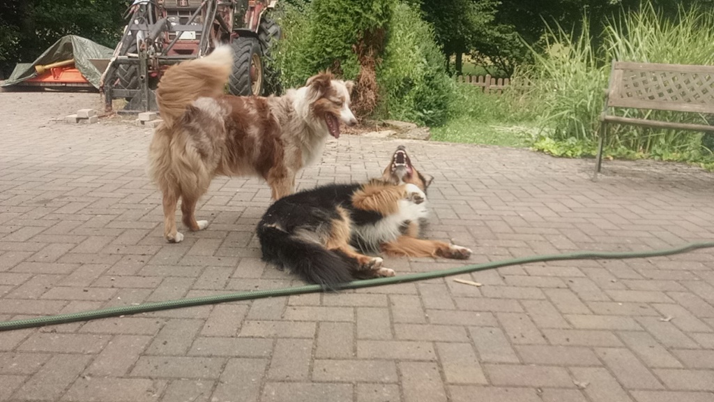 Ich lernte kürzliche eine Hündin kennen, deren Elterntiere, insbesondere die Mutter tragend das Vieh noch bis zur vorletzten Schwangerschaftswoche nach Hause getrieben hat. Und mit dem darfste halt nicht viel schmusen, der muss erstmal kapieren, wo die Pfeiffe pfeift. Aber da konnte ich auch das Bewegungsmuster "packen" sehen als sie im Spiel meine Hündin mit ihren Vorderpfoten und abgespreizten Wolfskrallen den Hintern meiner Hündin packen wollte,