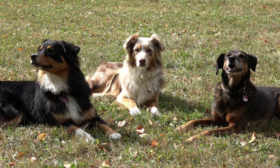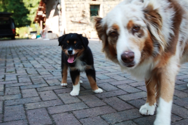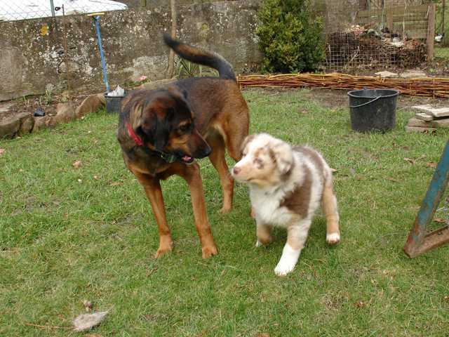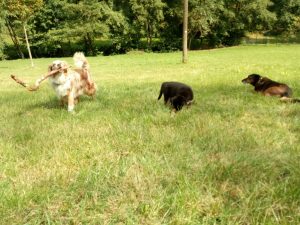 Ein Welpe ist an allem und an jedem interessiert, der Mensch kann es für sich nutzen, wenn man oder das Rudel ihn bei Fehlverhalten korrigiert und vor allem bei korrektem, und erwünschtem Verhalten bestätigt. Aber auch meine Hündinnen, gerade Carla hat den jungen Mann schwer im Schlepptau. Und Hanna kommandiert von hinterster Front!
