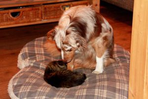 Hier auf dem Bild zieht Carla ein Katzen Junges groß, das wurde ganz schön behütet und durfte ohne Begleitung oft nirgends hin und wenn es seinen zugewiesenen Platz verließ wurde es mit der Nase zurück geschuppst oder auch schon mal wieder zurückgetragen.