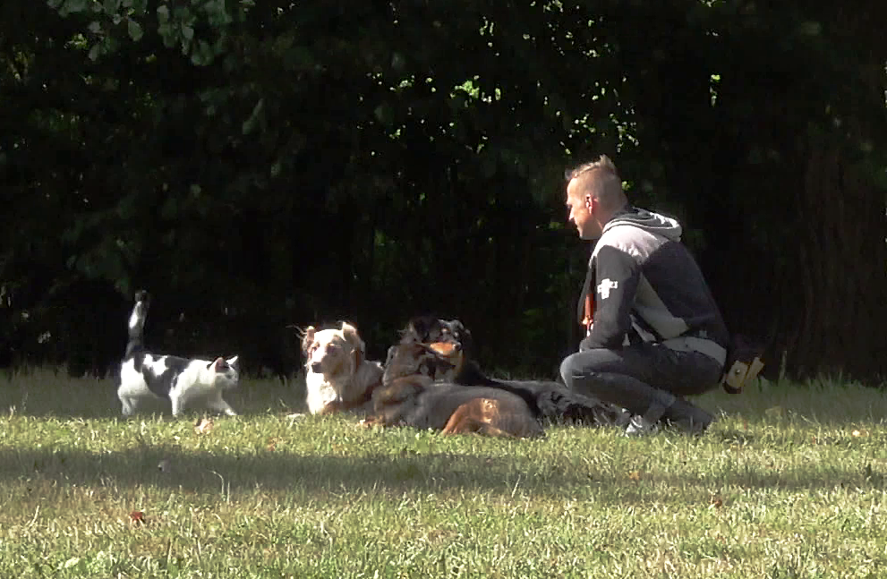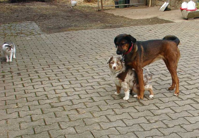 In unserem Rudel pflegen wir Beziehungen miteinander. Die Hunde unter sich, die Katzen untereinander, Katzen und Hunde miteinander, harmonisch jeder mit seinen Regeln und Grenzen, die ich unterstütze, ich mit meinen Regeln und Grenzen dem Rudel gegenüber und jedem Einzelnen, ja und da achtet auch meine Hündin schon drauf, dass Paul sich daran hält.