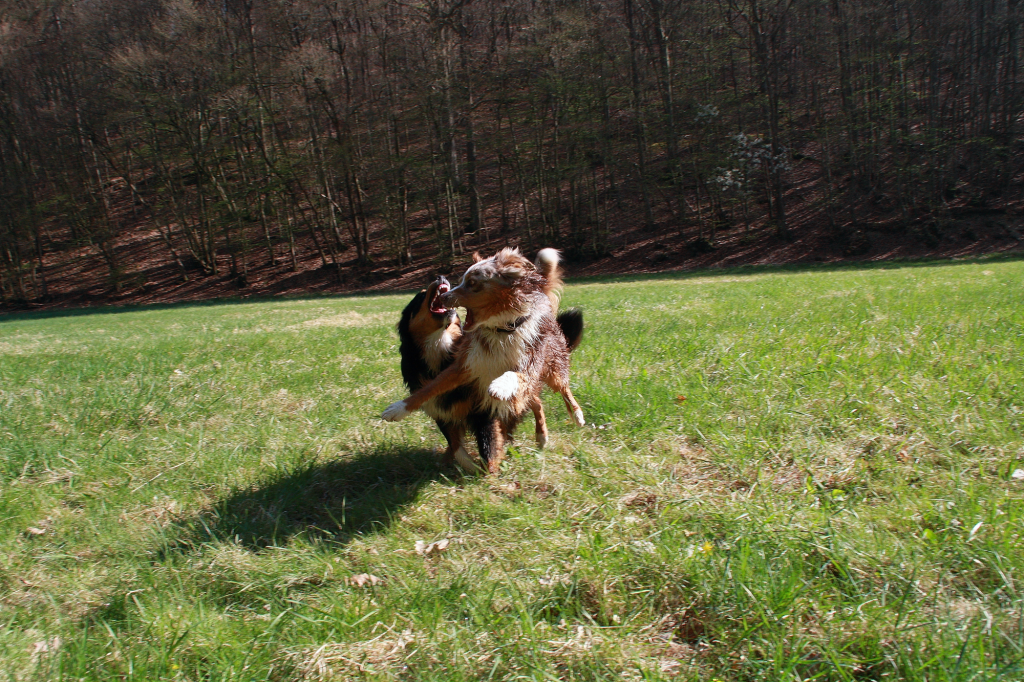 Das Rudel schläft zusammen, regelt wer Wache hält, passt aufeinander auf und versorgt sich gegenseitig mit Nahrung. Wobei die Nahrungsbeschaffung heute dem Menschen obliegt. Unser Paul ist mittlerweile auch schon groß und beschützt die Mädels hervorragend, wenn Hanna anschlägt - schiebt er sich selbstbewusst davor.
